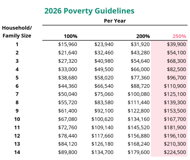 –Entire household income is at 250% of the current Federal Poverty Guideline or below.